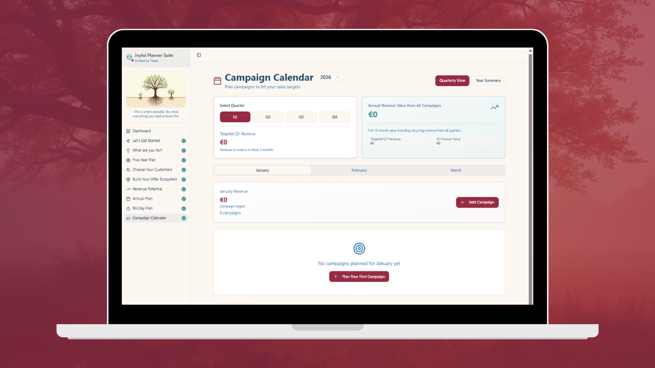 Each part of the system is clearly laid out and easy to return to — from Purpose to Campaigns — so you can always see where you are and how each part connects.